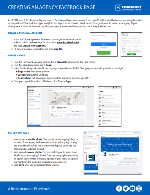 Facebook is one of the largest social networks, which means it can be a great place to market your agency. If you don’t have an agency Facebook page, this job aid provides guidance on how your agency can create one!