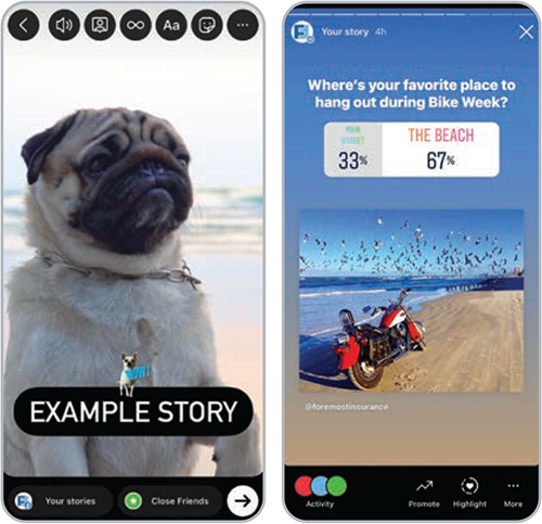 Stories are content (photos, videos or other graphics) that show up for 24 hours – after that, they disappear. Ephemeral posts like this are excellent for sharing quick updates, daily moments from your office, announcing new posts or reels on your feed, running interactive content (like polls), sharing other people's posts or reels, and giving shoutouts to other accounts.