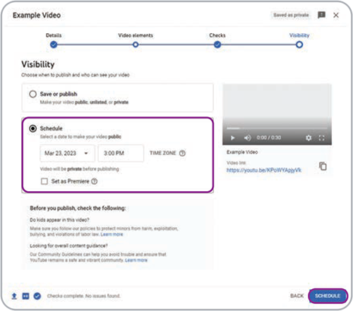 When uploading a new video, you'll find a schedule option under "Visibility." Simply select the date and time you'd like your video to be published and click the Schedule button.
