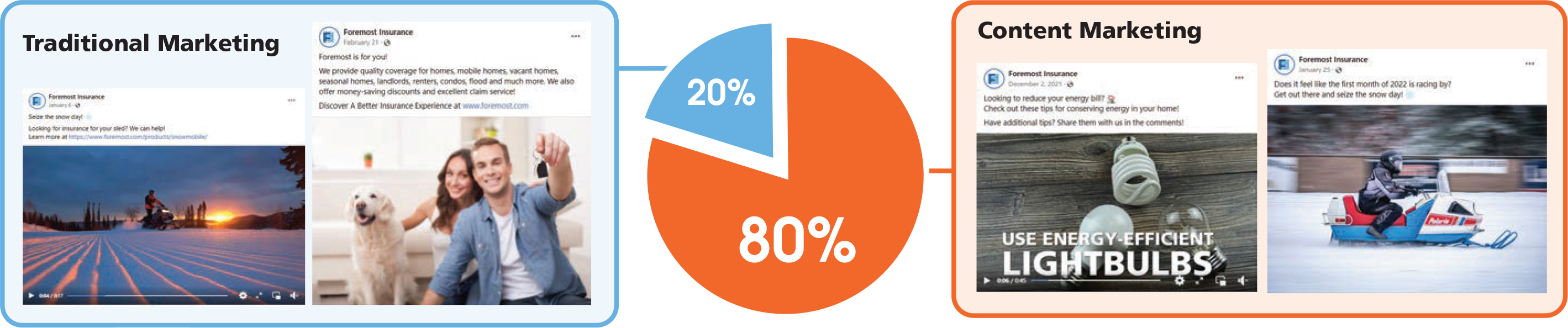 You'll hear about “content” and “content marketing” a lot when learning more about social media. Content marketing involves creating posts that your customers find relevant, shareable and conversational. Content creation is a tactic for playing the social media marketing long game because it helps you build strong connnections with potential customers. the goal is that they will get to know your agency's brand. And — when the times' right — they'll know who to reach out to when it comes to finding an insurance policy.